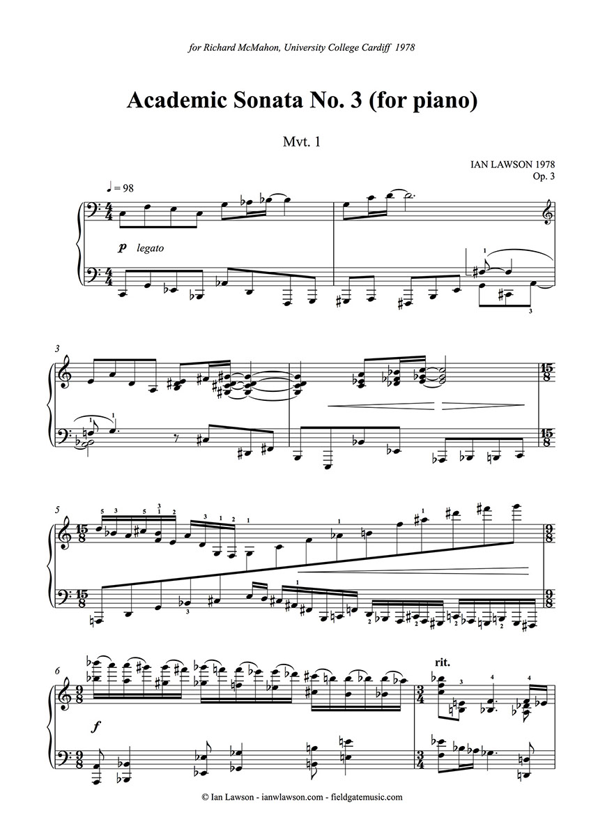 This is the third of five multi-movement sonatas I wrote in the late 70s when I was a post-graduate composition student at Cardiff university. The 'academic' tag relates to those circumstances rather than a descriptor of music - which I don't think sounds particularly academic. It was first performed at that time by Richard McMahon.
